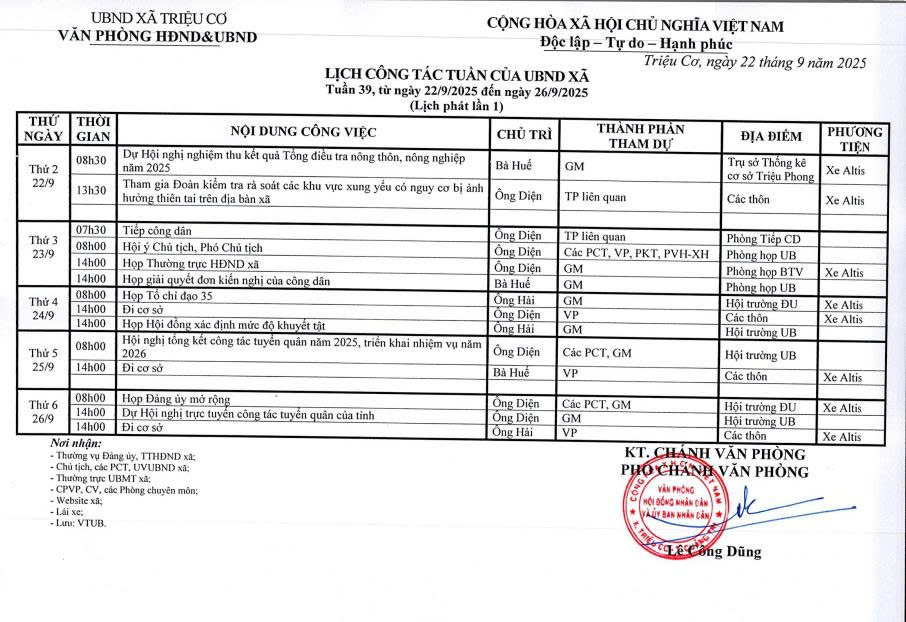 LỊCH CÔNG TÁC TUẦN UBND XÃ TRIỆU CƠ TỪ NGÀY 22/9/2025 ĐẾN 26/9/2025