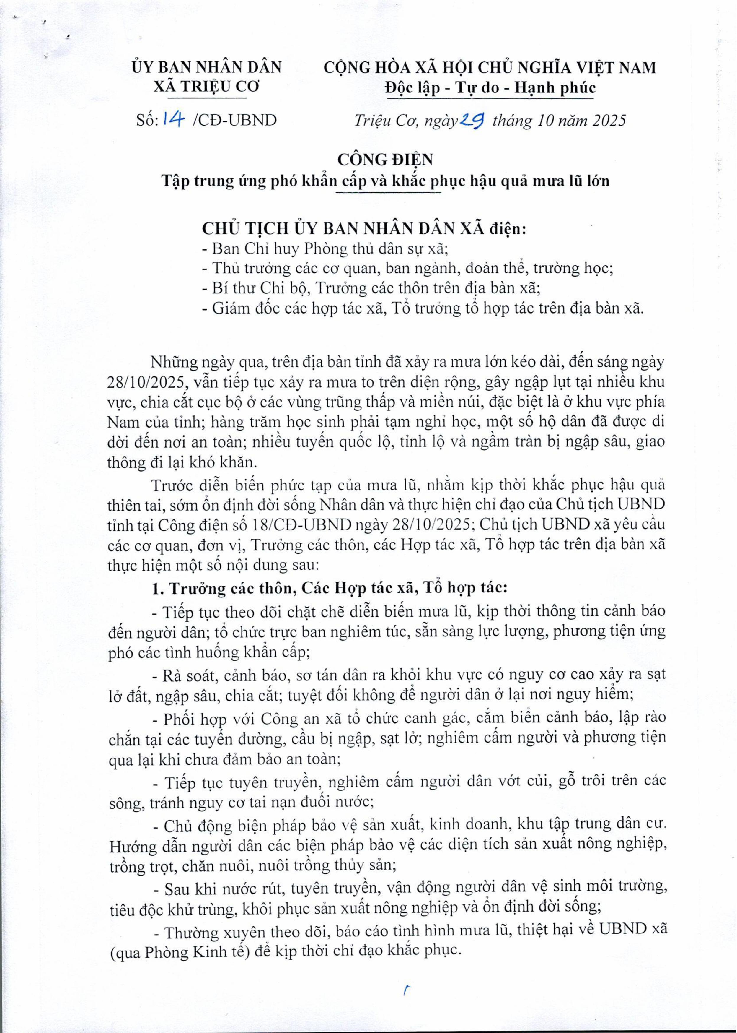 - UBND XÃ TRIỆU CƠ TRIỂN KHAI NHIỆM VỤ PHÒNG, CHỐNG BÃO SỐ 10 (27/09/2025)