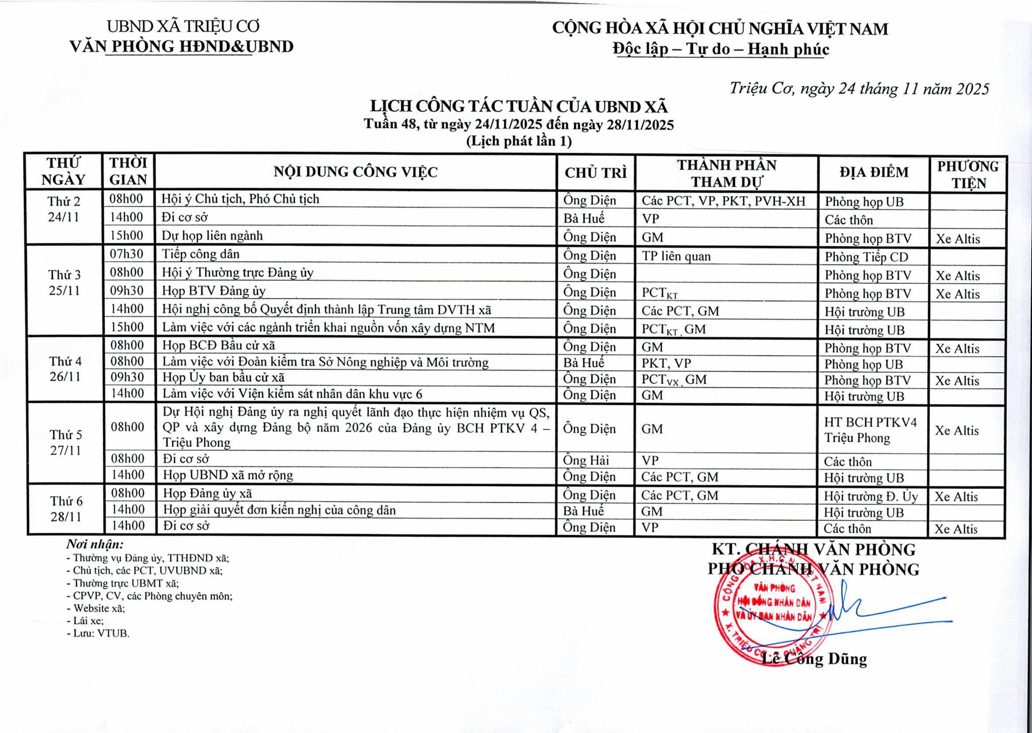 LỊCH CÔNG TÁC TUẦN CỦA UBND XÃ TRIỆU CƠ TỪ NGÀY 24/11/2025 ĐẾN NGÀY 28/11/2025