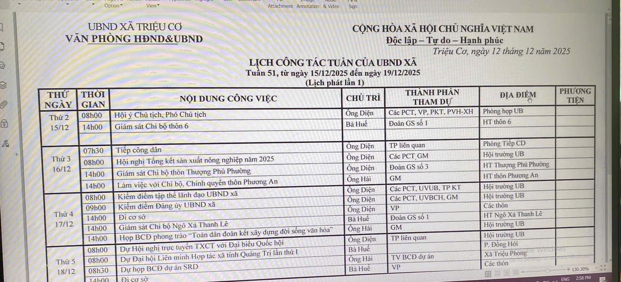 LỊCH CÔNG TÁC TUẦN CỦA UBND XÃ TRIỆU CƠ TỪ NGÀY 15/12/2025 ĐẾN 19/12/2025