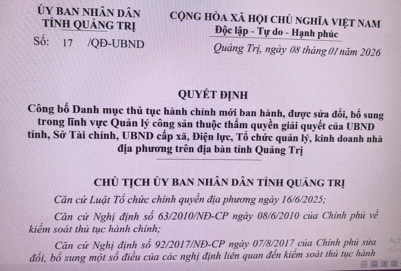 QUYẾT ĐỊNH Công bố Danh mục thủ tục hành chính trên địa bàn tỉnh Quảng Trị