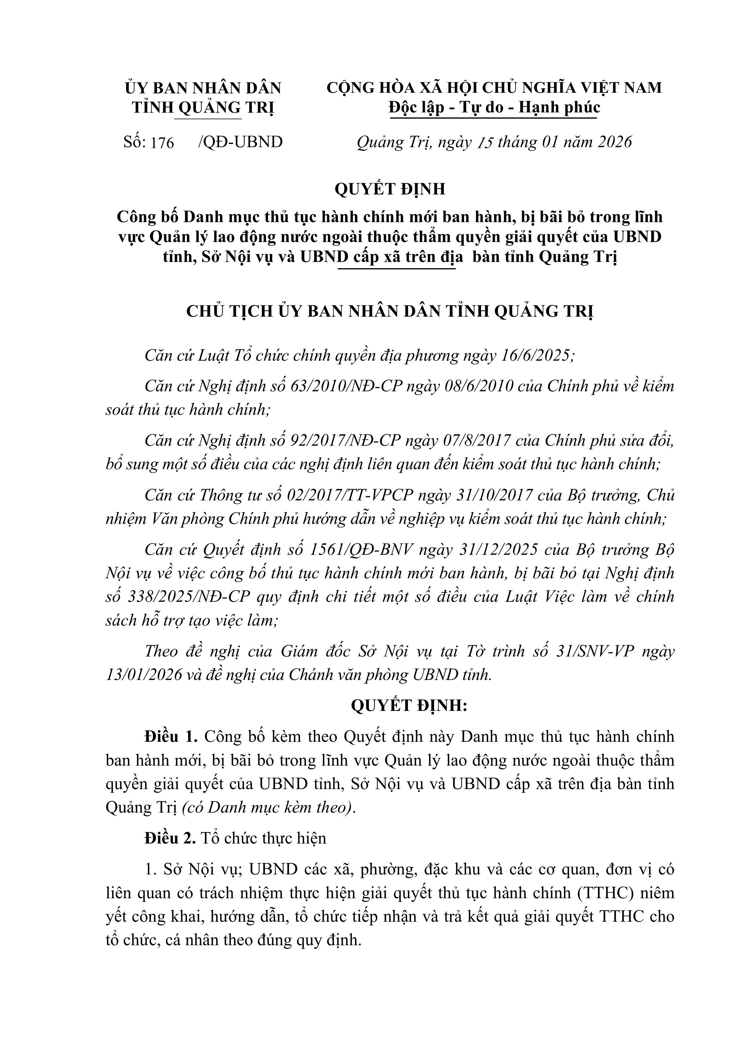 - QUYẾT ĐỊNH Công bố Danh mục thủ tục hành chính trên địa bàn tỉnh Quảng Trị (10/01/2026)