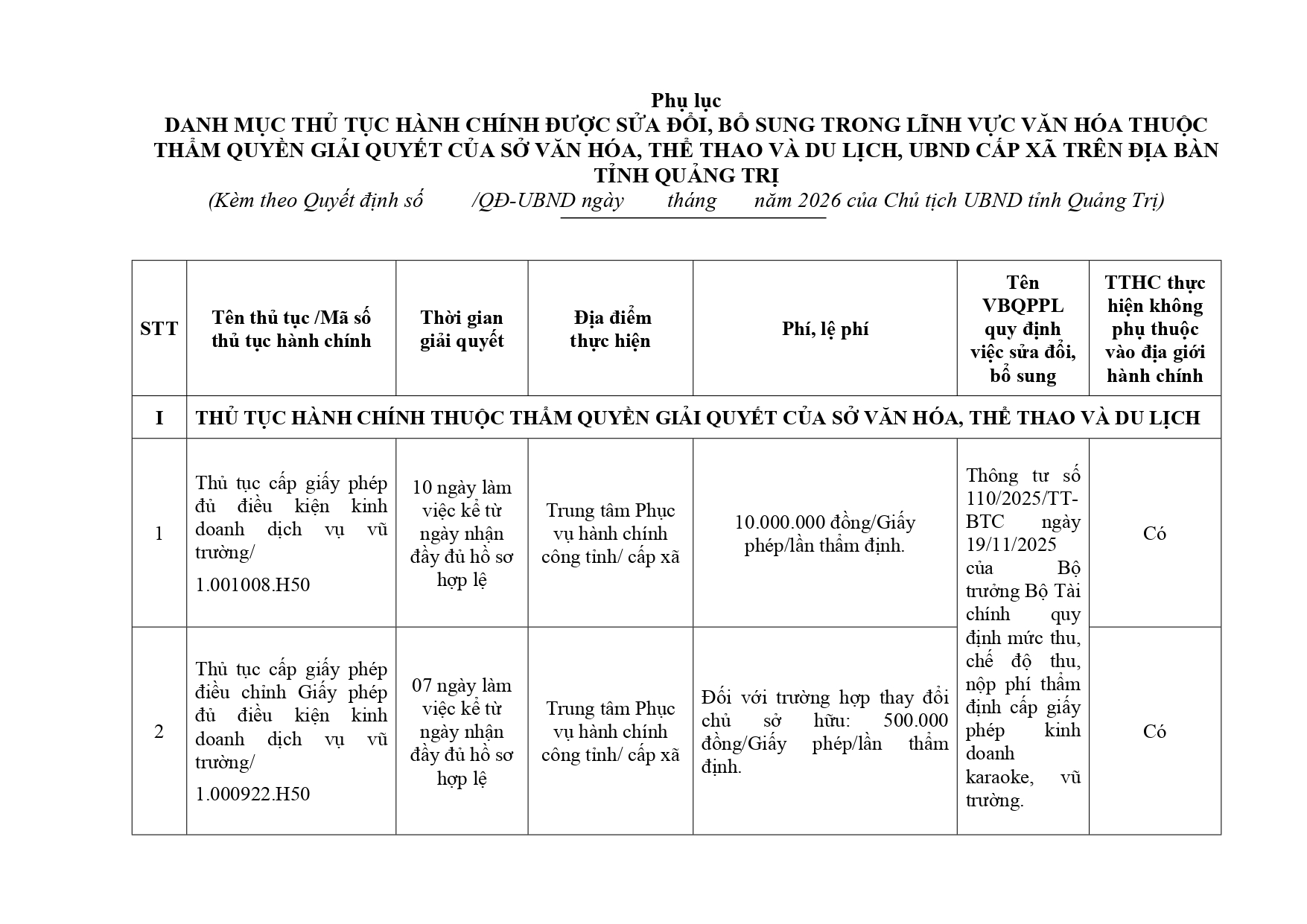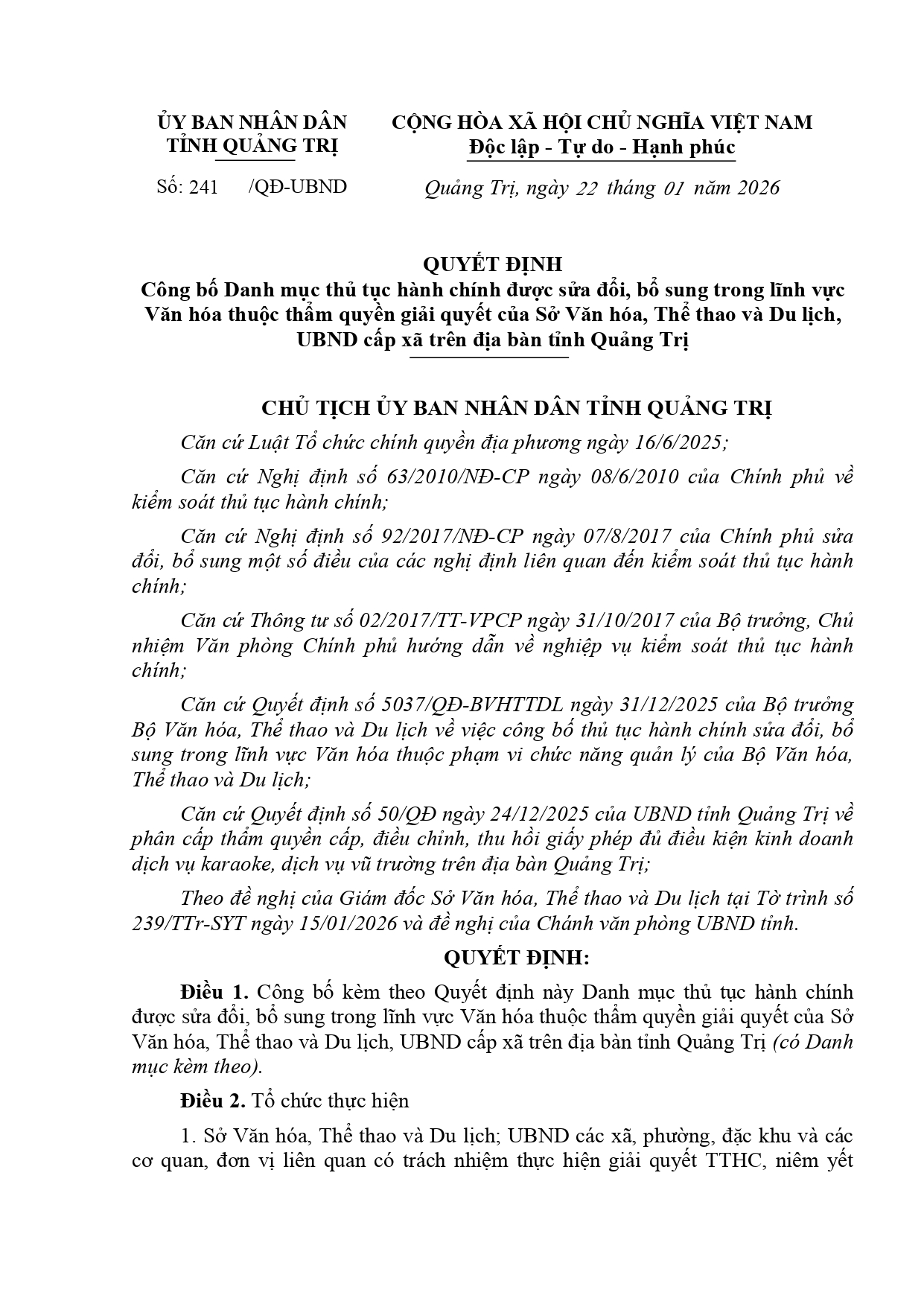 - QUYẾT ĐỊNH Công bố Danh mục thủ tục hành chính trên địa bàn tỉnh Quảng Trị (10/01/2026)